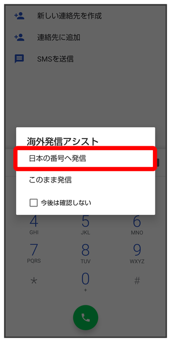 ダイヤルキーをタップして相手の電話番号を入力- 電話番号の先頭には「+」を付けないでください。