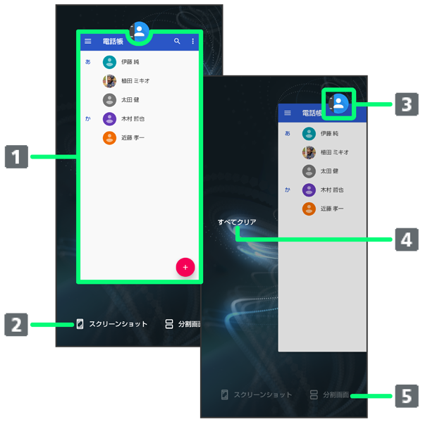 アプリの使用履歴画面でアプリの履歴のアイコンをタップ画面に従って操作- アプリ使用履歴画面で画面に従って操作しても、画面を分割できます。