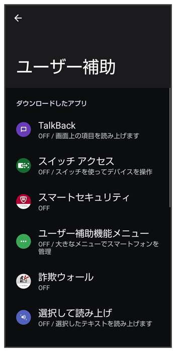 | ダウンロードしたアプリ | (画面上の項目を読み上げ)、(スイッチを使って本機を操作)、(大きなメニュー表示)、などが追加されます。 |