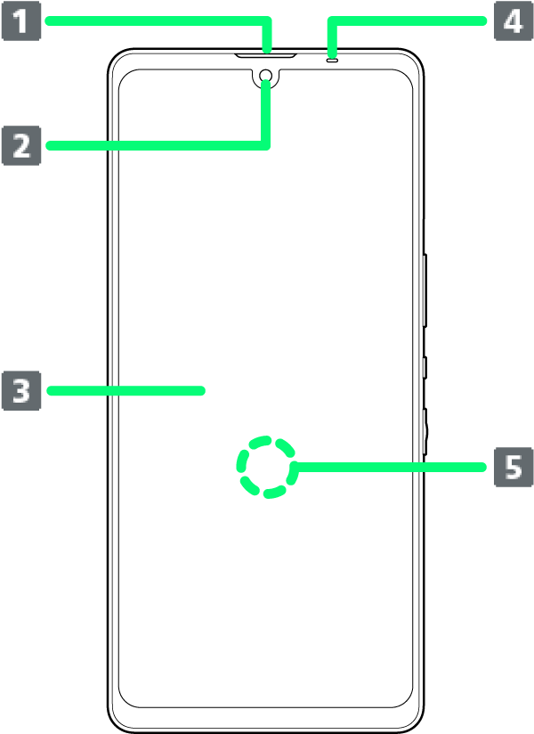 | 近接/明るさセンサー1 | 近接センサーは通話中にタッチパネルの誤動作を防ぎます。明るさセンサーは周囲の明るさに合わせて、ディスプレイの明るさを調節します。 |