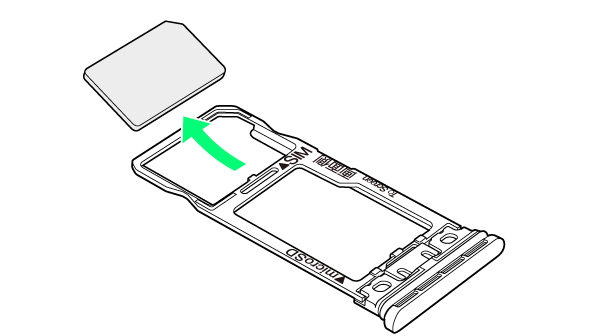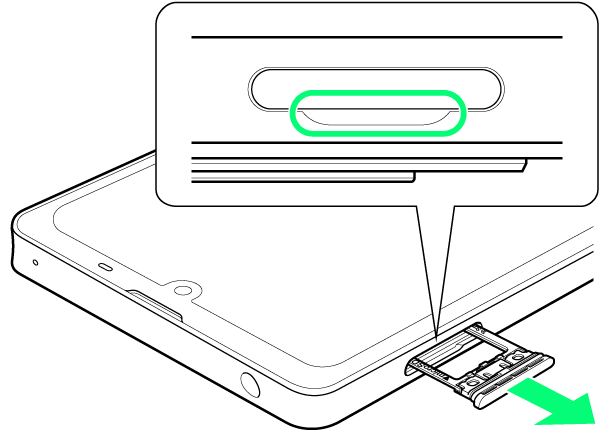 - ディスプレイを上にして、カードトレイを引き出してください。ディスプレイを下にしたり、本機を立てた状態でカードトレイを引き出すと、SIMカードやSDカードがカードトレイから外れ、紛失する可能性があります。
