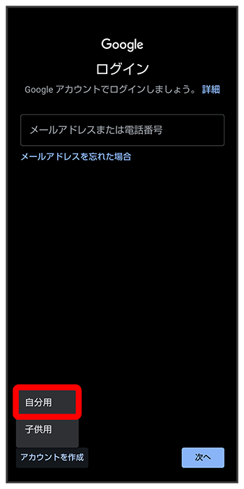 - 子供用のアカウントを作成する場合は、をタップし、画面に従って操作してください。
