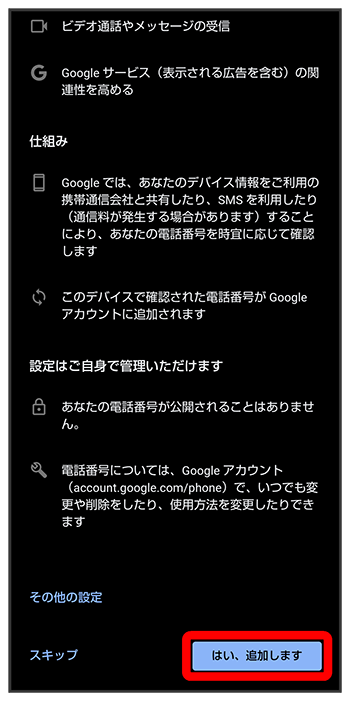 - 電話番号の追加をしないときはをタップします。