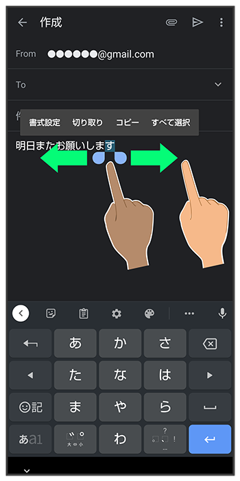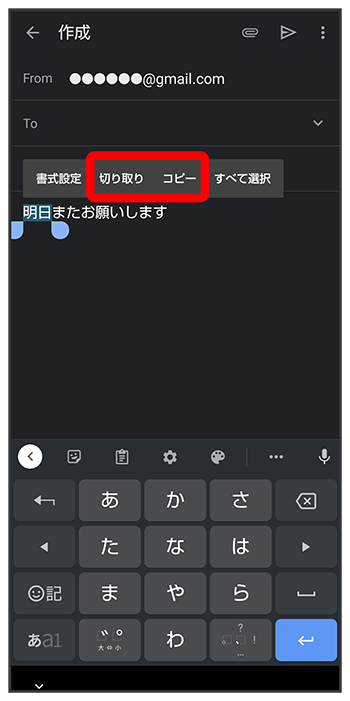 を左右にドラッグして、切り取り/コピーする文字を選択