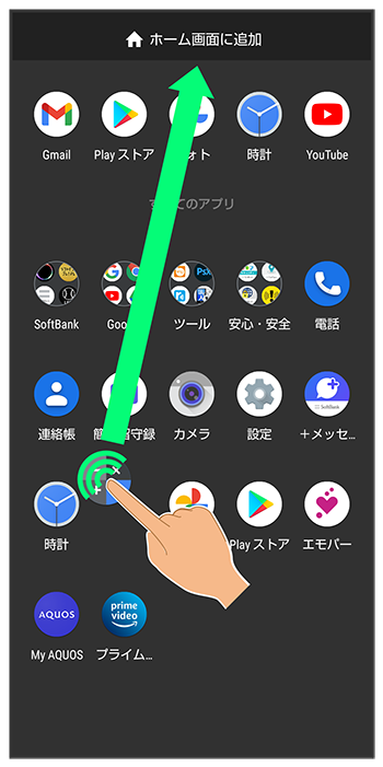 アプリ一覧画面でアプリをロングタッチし、「ホーム画面に追加」までドラッグ