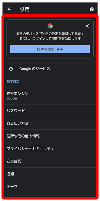 | 同期を有効にする | Google アカウントでログインして、ブックマークや履歴などの設定を利用できます。ログインすると、アカウント情報が表示されます。 |