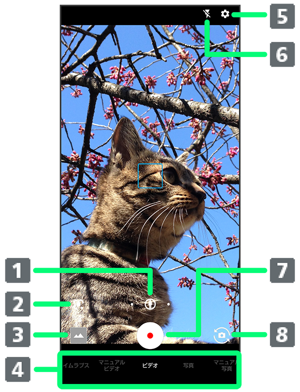 撮影時の各種設定を行います。詳しくは、「動画撮影の設定をする」、「写真/動画撮影共通の設定をする」を参照してください。 - モバイルライト
