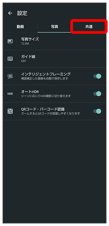 | セルフタイマー表示 | 写真/動画撮影画面にセルフタイマーのアイコンを表示するかどうかを設定します。 |