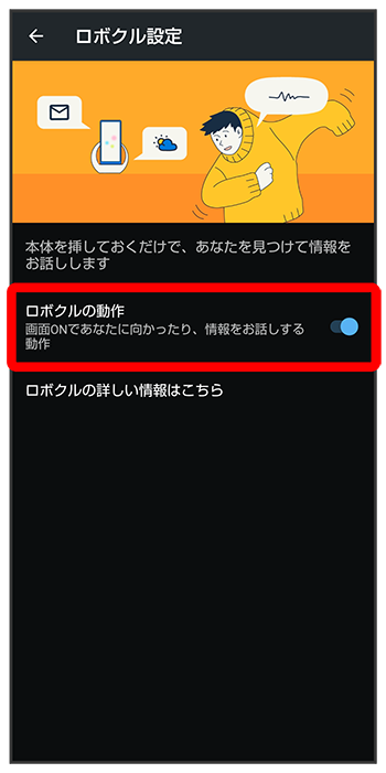 - 有効にすると、本機の電源が入っているとき、ロボクルで充電すると、ディスプレイ点灯時や充電開始、着信、アラームなどに連動してロボクルが回転します。