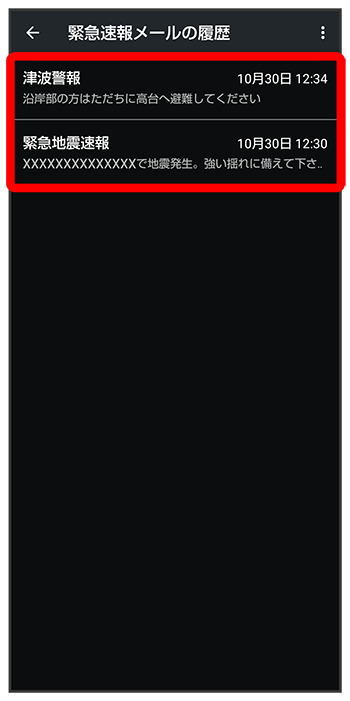 緊急速報メール受信メッセージ一覧画面が表示されます。