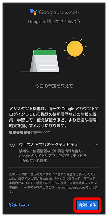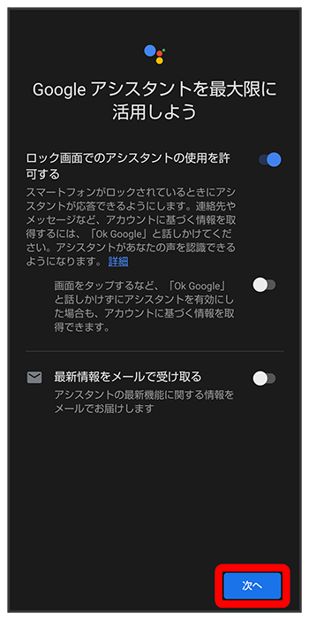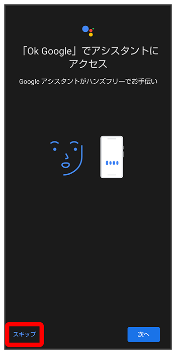 - Voice Matchを使うと、アシスタントキーを押す代わりに、画面点灯時に本機に「OK Google」と話しかけることで、音声操作が利用できます。Voice Matchを使いたい場合は、をタップしたあと、画面に従って操作してください。