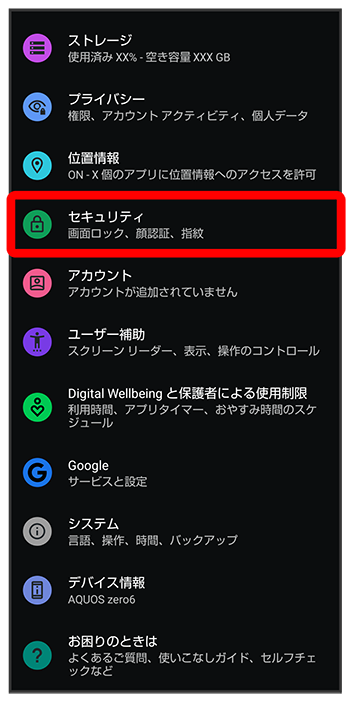 - 画面ロック解除方法の設定について詳しくは、「パターンを指でなぞって画面ロックを解除するように設定する」、「ロックNo.(PIN)で画面ロックを解除するように設定する」、「パスワードで画面ロックを解除するように設定する」を参照してください。