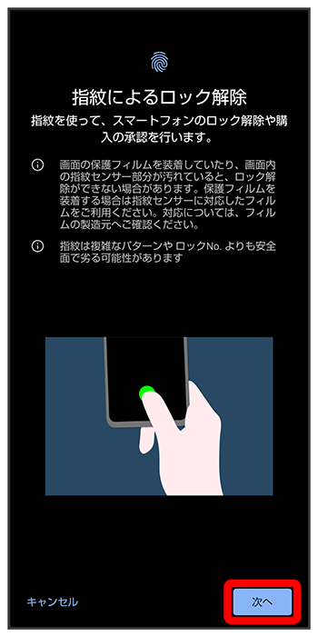 - 画面保護フィルムを装着していたり、画面内の指紋センサー部分が汚れていると、ロック解除ができない場合があります。