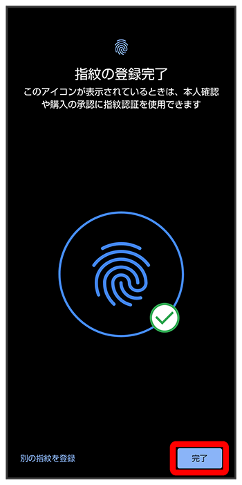 - 指紋の登録完了画面が表示されるまで繰り返してください。