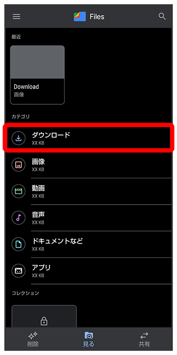 ダウンロード画面で、ファイルをロングタッチ- リスト表示でファイル名の右の