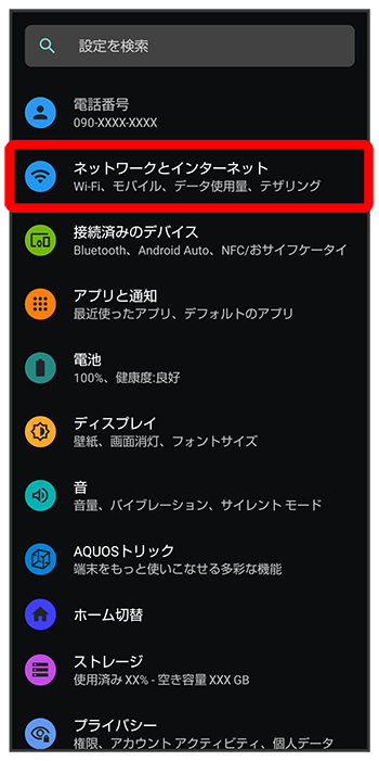 | Wi-Fiテザリング | Wi-Fi接続でテザリング機能を利用するかどうかや、Wi-Fiテザリングを利用する際のネットワーク名やセキュリティなどについて設定します。 |
