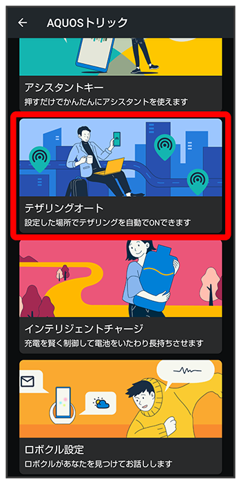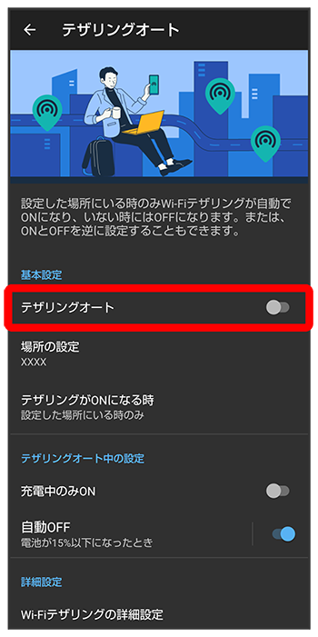 テザリングオート画面で削除したい場所のWi-Fiテザリングが有効になるタイミングを設定する