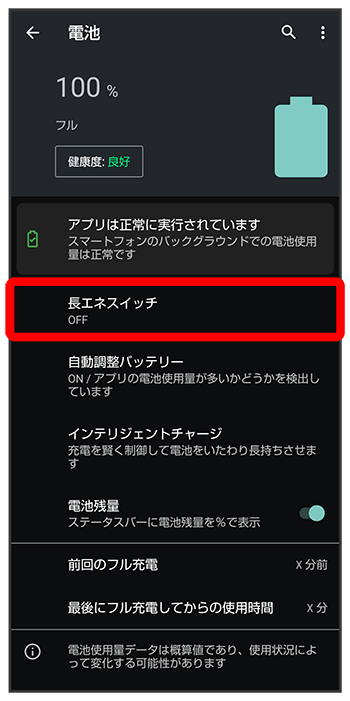 電池残量が90%になったときに長エネスイッチを自動的に無効にするかどうかを設定する