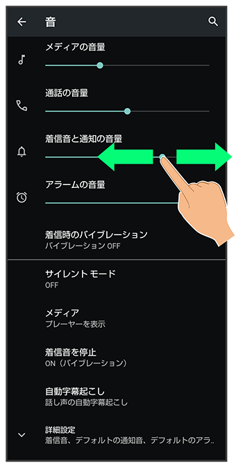 を右にドラッグすると音量が大きく、左にドラッグすると音量が小さくなります。