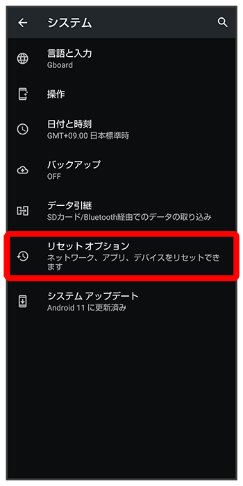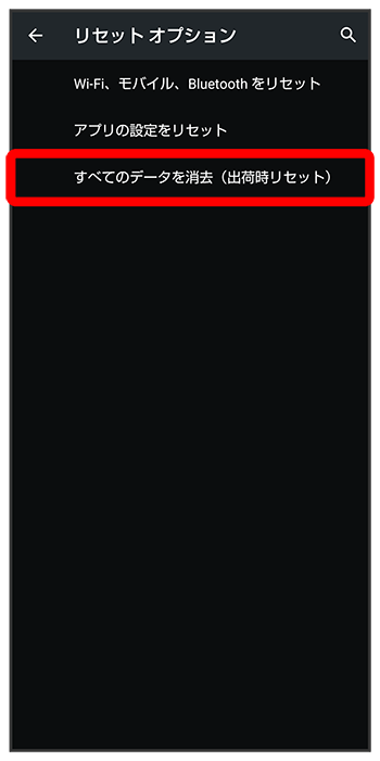 - すべてのデータを消去(出荷時リセット)を行うと、内部ストレージのデータがすべて消去されます。必要なデータは事前にバックアップをとることをおすすめします。