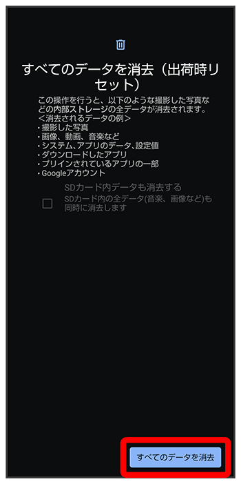 - 取り付けているSDカード内のデータも消去するときは、をタップします(