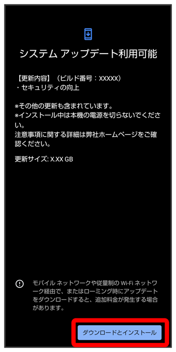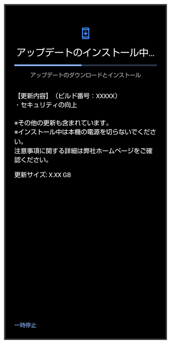 - システムアップデート中もほかの機能を使用できます。ただし、システムアップデートの通知後10日間は、システムアップデート中にほかの機能を使用していると、アップデートのインストールが一時的に停止されます。をタップすると、インストールが再開され、ほかの機能も使用可能になります。