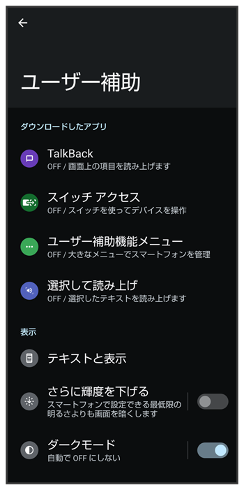 | ダウンロードしたアプリ | (画面上の項目を読み上げ)、(スイッチを使って本機を操作)、、(大きなメニュー表示)、などが追加されます。 |