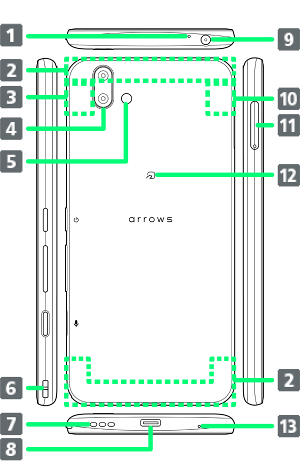| 内蔵アンテナ部 | 通話やデータ通信用のアンテナが内蔵されています。 |