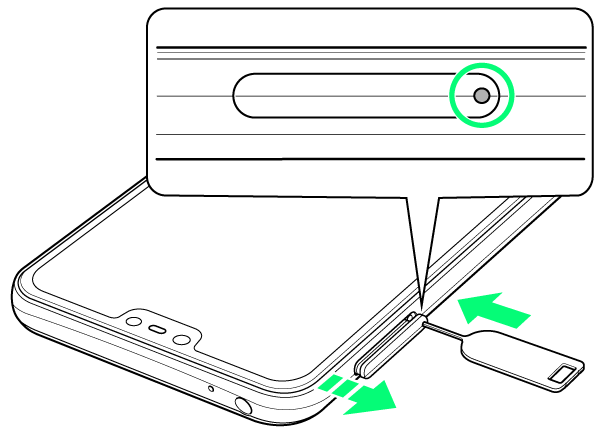 ディスプレイ側を上に向け、スロットキャップの穴にSIM取り出しピンの先を差し込む