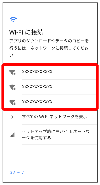 - Wi-Fi設定を省略するときは、をタップします。以降は、画面の指示に従って操作してください。