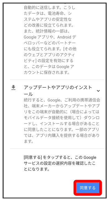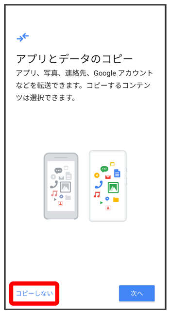 - をタップすると、Google アカウントを設定しているほかの端末からデータをコピーできます。画面の指示に従って操作してください。