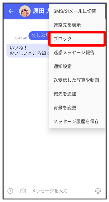 メッセージをブロックすると、ブロックした電話番号/メールアドレスからのメッセージがメッセージ一覧画面に表示されなくなり、受信しても通知されなくなります。ブロックしたメッセージは、ブロックメッセージフォルダに保存されます。また、ブロックした電話番号/メールアドレスへのメッセージの送信ができなくなります。