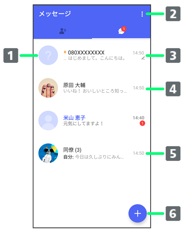 メッセージ一覧画面でメッセージをロングタッチ- メッセージの固定を解除するときは、メッセージ一覧画面でメッセージをロングタッチ