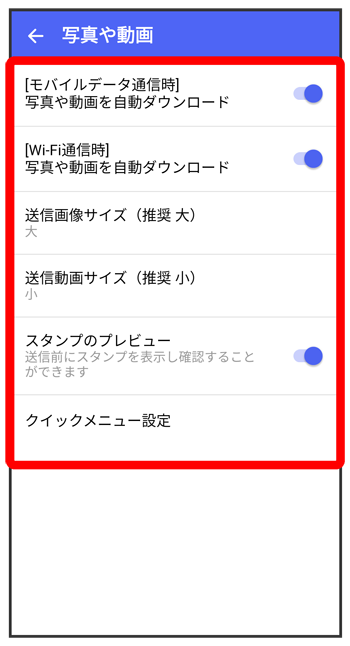 | [モバイルデータ通信時]写真や動画を自動ダウンロード | モバイルデータ通信時に受信した写真や動画を自動でダウンロードするかどうかを設定します。 |
