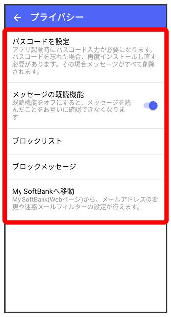 | My SoftBankへ移動 | My SoftBankへ移動し、メールアドレスの変更や迷惑メールフィルターの設定などができます。 |