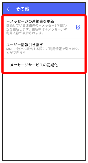 | +メッセージの連絡先を更新 | 連絡先の+メッセージの利用状況を更新します。 |