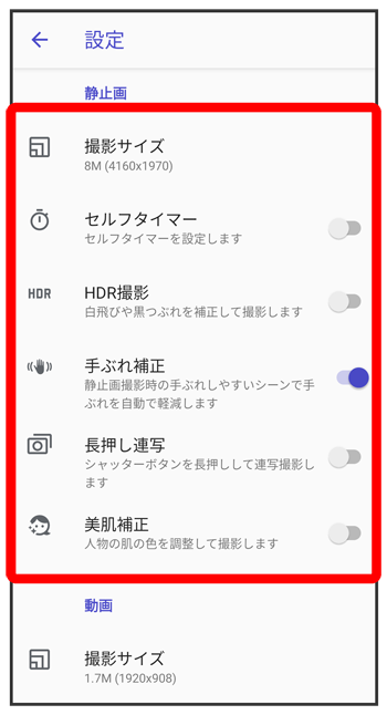 - ホーム画面/ランチャー画面以外からカメラを起動した場合、設定できない項目があります。