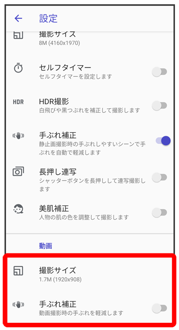 | 手ぶれ補正 | 手ぶれ補正を利用して動画を撮るかどうかを設定します。 |