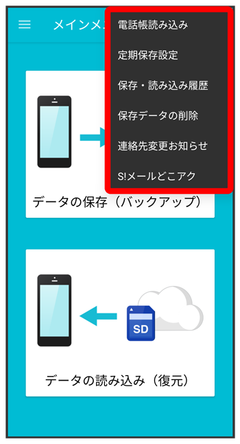 | S!メールどこアク1 | 本体の電話帳データを、「S!メール(MMS)どこでもアクセス」のサーバーにエクスポートします。 |
