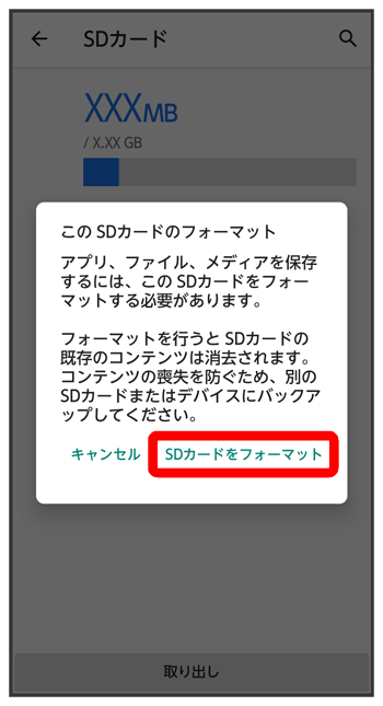 - フォーマットすると、SDカード内のデータがすべて消去されます。ほかの機器で使用したSDカードをフォーマットするときは、あらかじめよくご確認のうえ、操作してください。