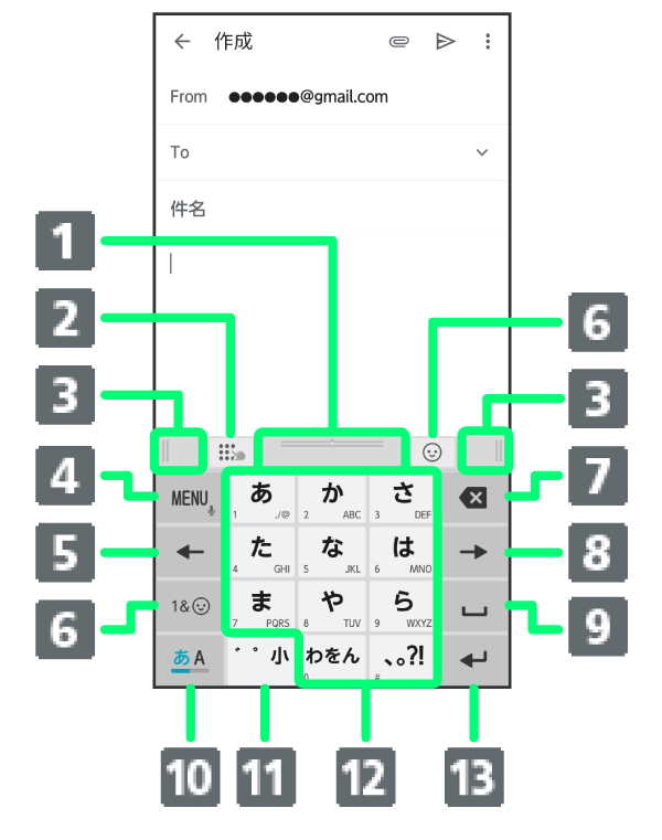 上下にフリックするとカーソルを上下に移動、右にフリックするとカーソルを右に移動します。 - 数字/記号/顔文字/絵文字一覧を表示します。