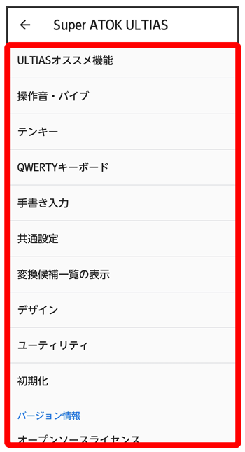 | ULTIASオススメ機能 | 選べるキーボードやスマホ入力(フリック)学習モード、ATOKキーワードExpressについて設定できます。 |