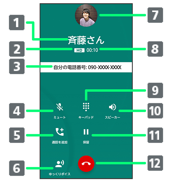 )で通話中に表示されます。 - 自分の電話番号が表示されます。