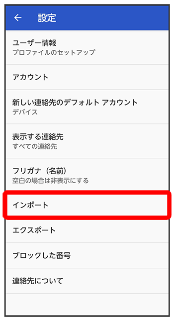 SDカードに保存(バックアップ)した連絡先データを読み込み(インポート)できます。