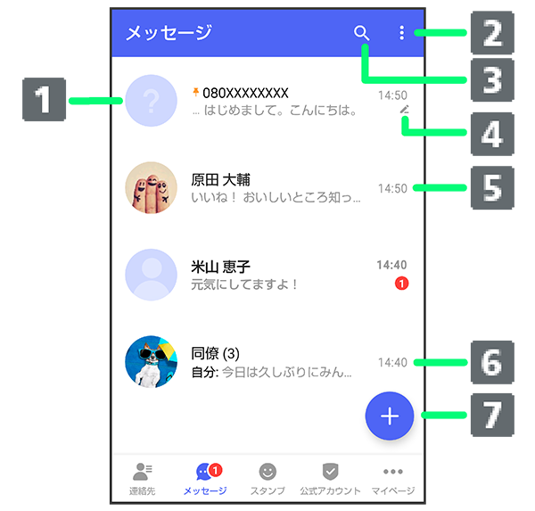 メッセージ一覧画面でメッセージをロングタッチ- メッセージの固定を解除するときは、メッセージ一覧画面でメッセージをロングタッチ