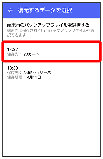 内部ストレージ/SDカードにバックアップしたデータを選択