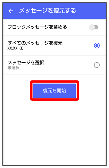 - ブロックしたメッセージを含めて復元する場合はを有効(