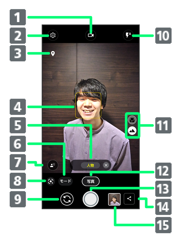 - 自動で検出されたシーン(人物、夜景、逆光/HDR)を表示