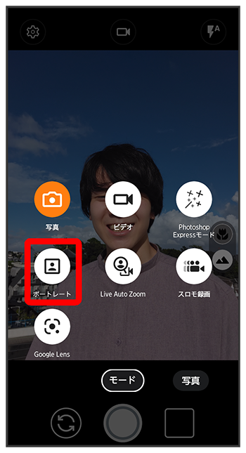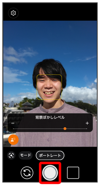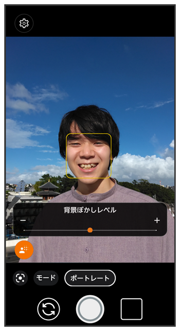 - ポートレート撮影画面で人の顔が認識されると、フォーカス枠が表示され自動的に背景にぼかしが入ります。