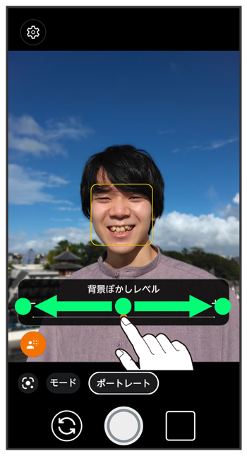 手動でぼかしの度合いを調節するときは、背景ぼかしレベルの調節バーを左右にドラッグ